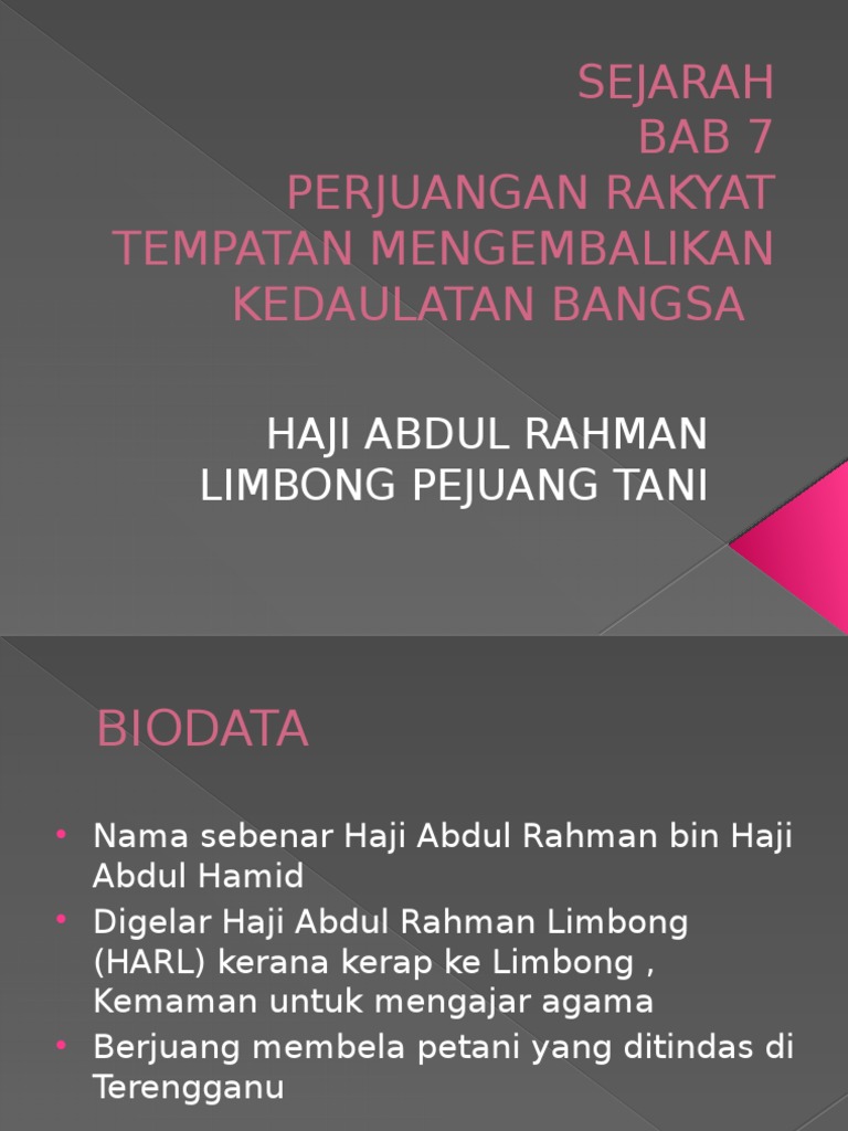 Open land isbirthday biodata haji abdul. From 1922 until 1928, he was a resistance leader seeking to resist laws and changes introduced by the british. Haji abdul rahman limbong was a religious scholar and a malay fighter feared by the british colonialists. Haji abdul rahman bin haji abdul hamid (1868—1929) was an ulema, known as haji abdul rahman limbong because he visited limbong, kemaman to teach islam and start trading. Sop solat berjemaah di surau 1.