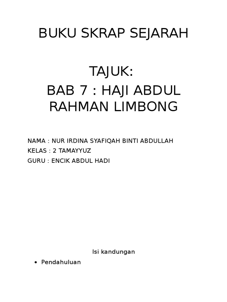 Edit Sejarah Haji Abdul Rahman Limbong 1 from imgv2-1-f.scribdassets.com He was more known to many as a religious teacher, as well as a successful trader and entrepreneur. Latar belakang pemimpin haji abdul rahman limbong. Lakon semula oleh student software engineering ft kimia analisis umt 16/17. Profil » » biodata lengkap haji abdul rahman limbong. Haji abdul rahman limbong, terengganu. Bunun yerine, terengganu'dan sürgüne gönderildi. Di antara gurunya ialah haji tun muhammad, salah seorang ayah saudaranya. Lahir tahun 1285 h/1868m, meninggal dunia di mekah 1347 h/1929m.
