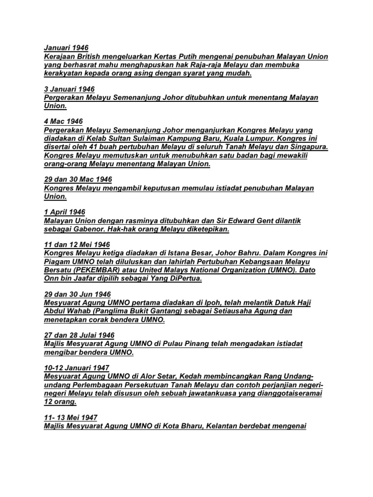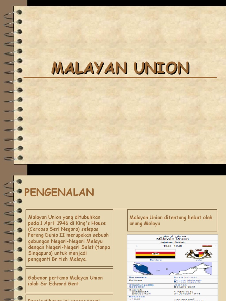 Malayan Union from imgv2-2-f.scribdassets.com Golongan imigran sokong malayan union atas alasan yang sama. Jaafar = yang dipertua umno yang pertama. Singapura tidak termasuk dalam malayan union. Malayan union mewujudkan sebuah kesatuan yang dikuasai oleh sebuah pemerintan pusat yang kuat •gabenor british : Unsur pertama, perlembagaan malayan union menjadikan tanah melayu sebagai tanah jajahan mahkota british. · sebab orang melayu membantah malayan union. Sir edward gent dilantik sebagai gabenor pertama. Terdapat sultan yang menandatangani perjanjian malayan union atas dasar setia kawan kepada british seperti sultan selangor dan sultan johor.